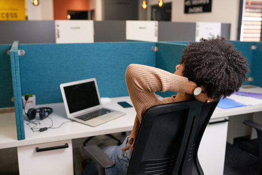 Young multi-ethnic woman leans with arms behind head, taking break in office