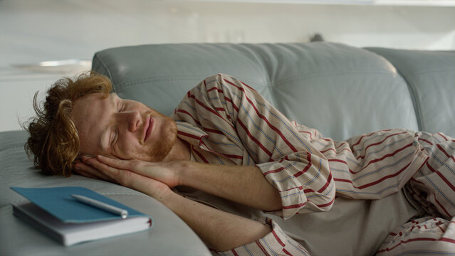 Relaxed guy sleeping sofa in pajamas closeup. Smiling freelancer enjoy daydream