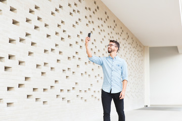 Mother taking photo of her adorable little toddler boy with smartphone. Family walking in the park. Small child with mom.