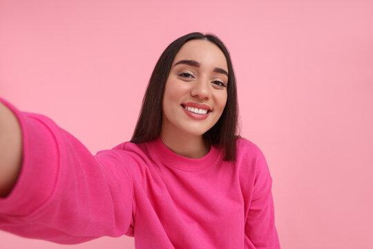 Attractive young woman using camera of smartphone taking sunny selfie at home