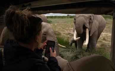 Girl on safari taking phone photos of elephants in Africa