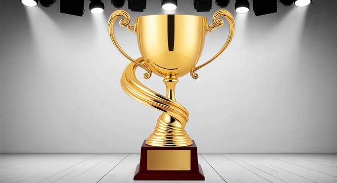 A gold trophy with a swirling base awarded to the best performer in a talent show on a plain stagelight white background