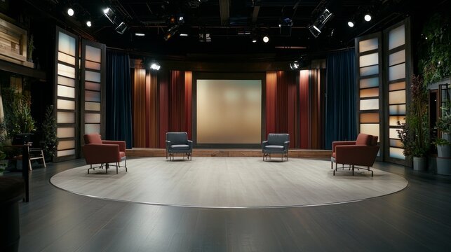 Frontal view of an empty modern tv talk show studio during live broadcast, focusing on host area