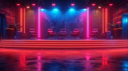 Empty talk show set ready for vibrant discussion. Stylish pink chairs, round table highlighted by bright stage lights in lively studio ambiance. Ideal for talk shows game shows. Modern, engaging
