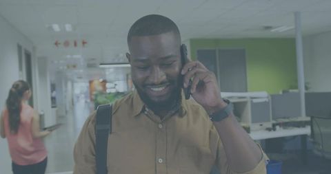 Smiling professional man on a phone call in a bright open-plan office, confidently managing business communication and networking while staying connected and productive