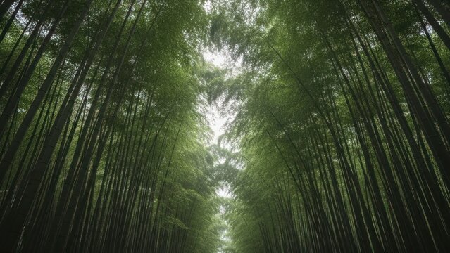 Vibrant bamboo forest, tall stalks reaching skywards, lush canopy