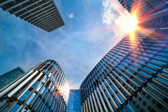 Sunrise over modern city skyline illuminating skyscrapers with lens flare
