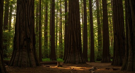 Majestic stag standing among sunlit oak trees in tranquil forest clearing