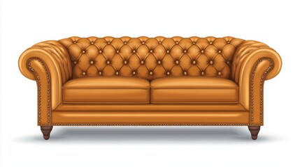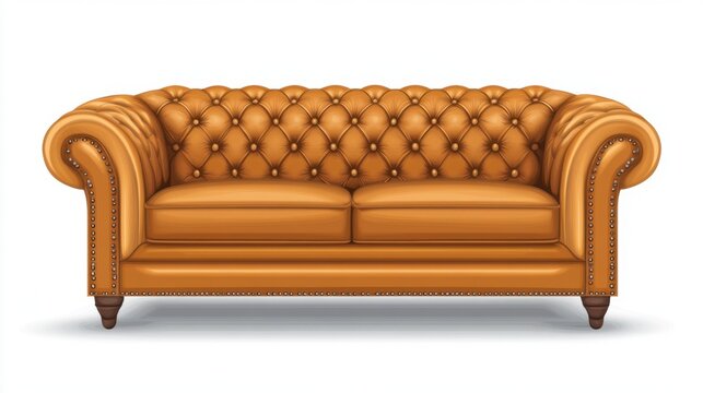 Polished tan leather couch with tufted seats and back on a seamless white background