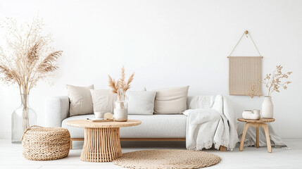 Cozy wooden interior featuring a minimalist sofa and a blank square canvas mounted on a neutral wall