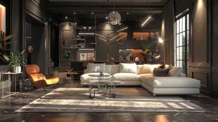 A sophisticated living room featuring a rich tan color palette, with minimalist furnishings and a clean, uncluttered layout. The image provides ample space for adding text or graphics.