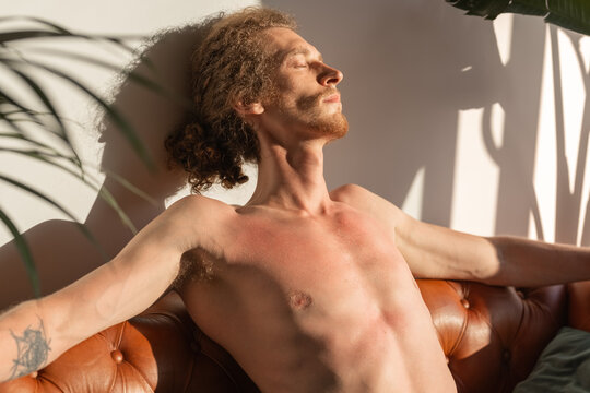 Man with sunburn resting on couch at home