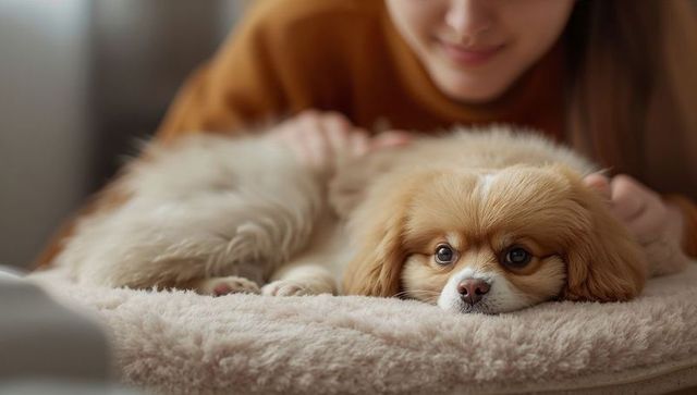 Cozy long-haired tan puppy resting on plush bed while owner petting, warm home comfort