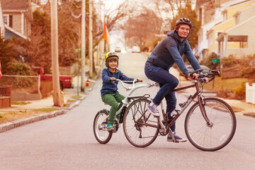 Family bike portrait with little happy boy ride on a tow tandem bicycle attached to father on urban street