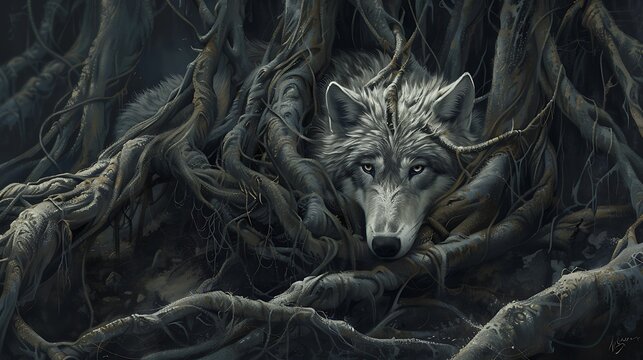 A wolf amongst tangled roots