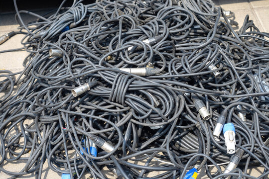 Wires from audio equipment. Tangled cables. Wires for concert equipment. Cable for lighting fixtures on ground. Tangled wires for electrical equipment. Cables for mounting concert stage