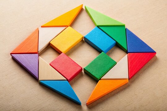 The tangram is wooden. The child plays with developing wooden eco-friendly toys. The concept of children's education