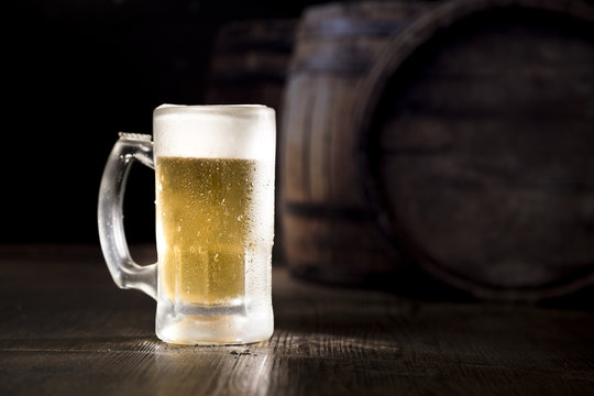 Wooden beer mug with foam on the dark red