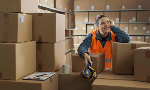 Happy warehouse worker having a break and thinking