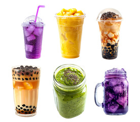 Pineapple juice and ice cubes, Bubble tea drink with tapioca pearls and Grape soda cocktail isolated on white background