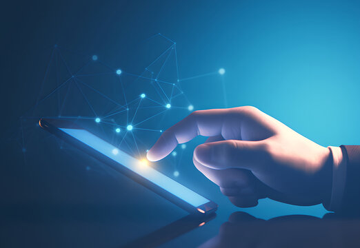 Hand interacts with glowing digital interface, network of connections. Finger taps on touchscreen