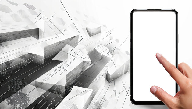 Person holding a generic smartphone with a blank white screen, tapping the display with their finger on a clean white