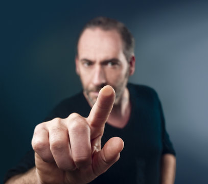 The businessman points his finger at the screen, presses and taps. Blank for the designer to hand.