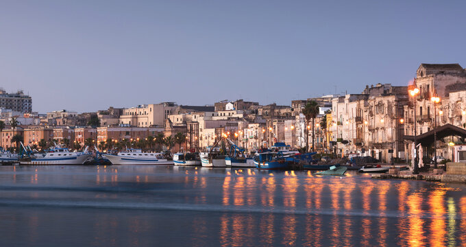 Night landscape of Aragonese Castle on seafront in Taranto. Italy amazing sunset