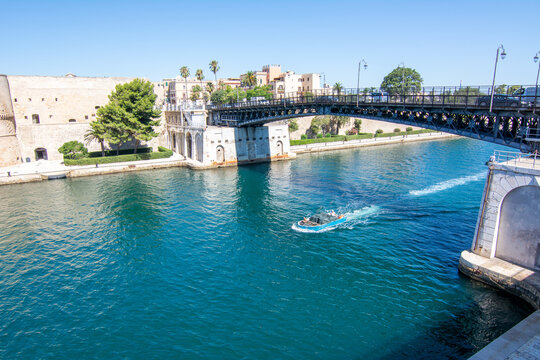 Aragonese Castle of Taranto and revolving bridge on the channel between Big and Small sea, Puglia, Italy, Blue sunny sky