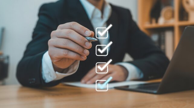 A businessperson pointing a pen towards a checklist. The checklist is marked with checkmarks, symbolizing completion and tasks.