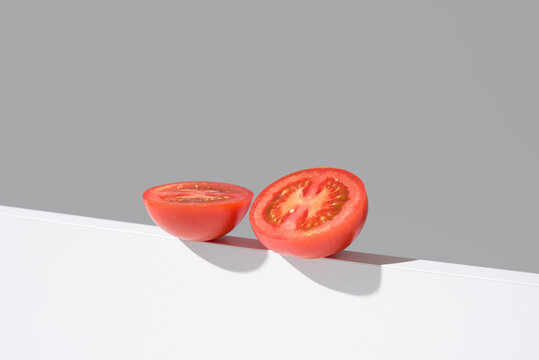 Un tomate maduro entero y cortado por la mitad sobre un soporte blanco y fondo gris