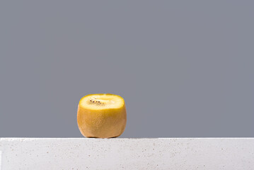 Rebanada de kiwi amarillo dorado sobre un soporte blanco y fondo gris