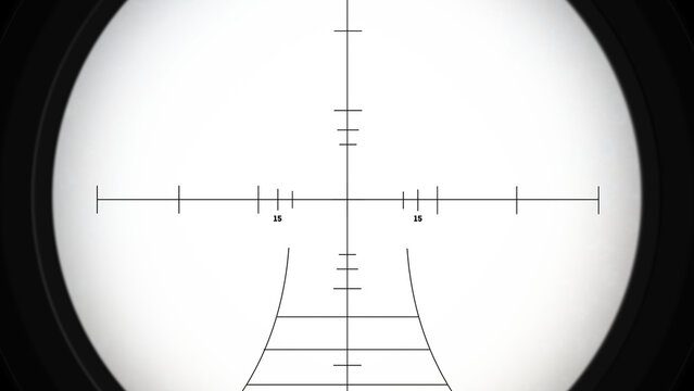 Close-up of a sniper scope aiming at a target with a crosshair reticle