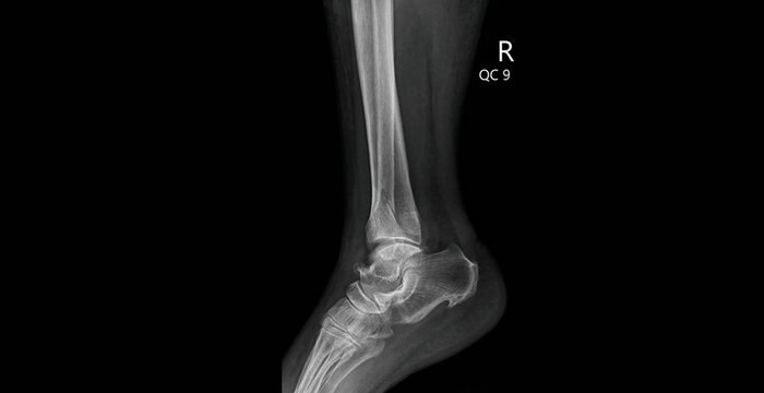 Lateral ankle X-ray showing tibia, fibula, talus and tarsal bones. Medical diagnostic imaging for orthopedic evaluation and ankle joint assessment.