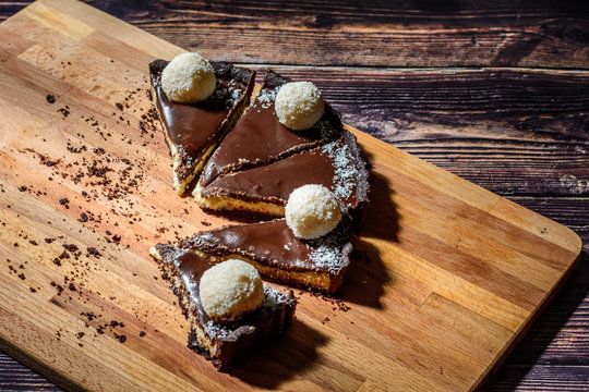 chocolate cake tart with coconut crust on wooden board