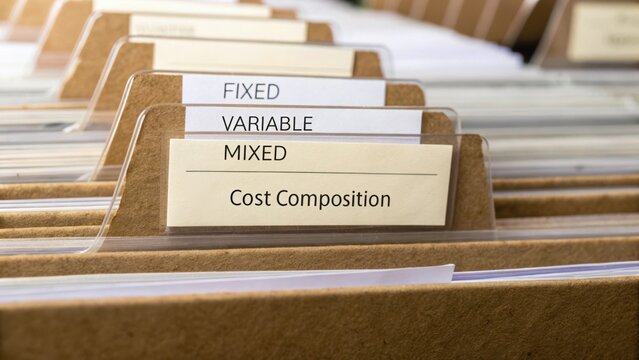 Detailed View of Organized File Folders with Labels for Fixed, Variable, and Mixed Cost Composition in Office Environment