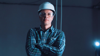 The adult taskmaster in white har hat standing at site and holding arms crossed looking straight at camera