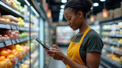 A young woman in a green shirt and orange apron focuses on her tablet, managing stock while surrounded by fresh produce in a grocery store aisle