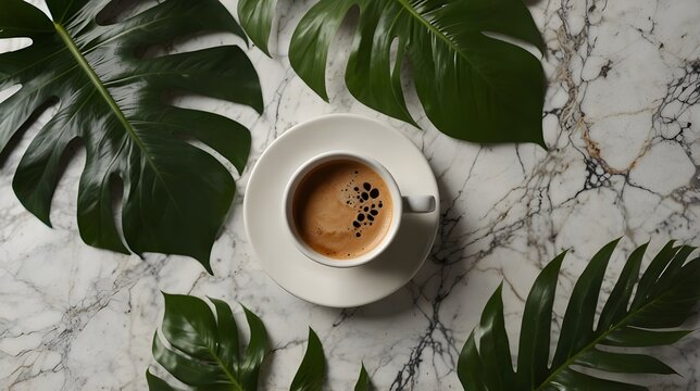 Gorgeous tropical foliage arranged tastefully to the side of an attractive top view of a hot coffee cup on a flat lay marble background combine to create a calm and fashionable composition.