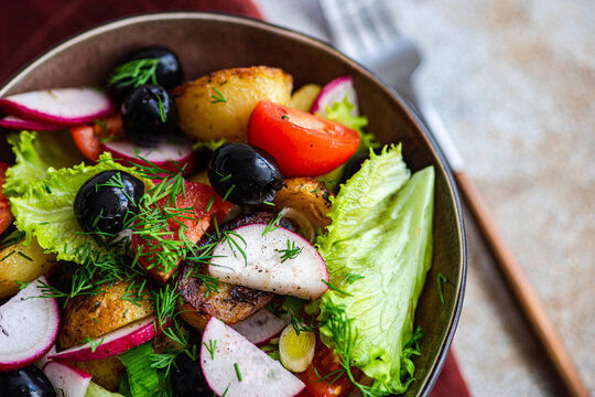 A close-up of a delicious Mediterranean salad bowl, with golden potatoes, ripe cherry tomatoes, black olives, spring onions, radishes, and lettuce, tastefully garnished with dill