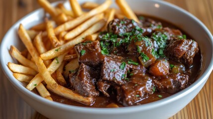 Savory beef stew with fries in a bowl garnished with fresh parsley