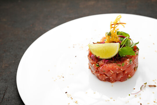 Delicious tuna tatar or tar-tar on white plate. Red fish fillet. Delicious food. Culinary concept.