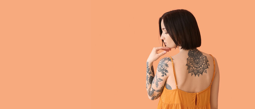Trendy woman with sunglasses and tattoos posing against yellow wall