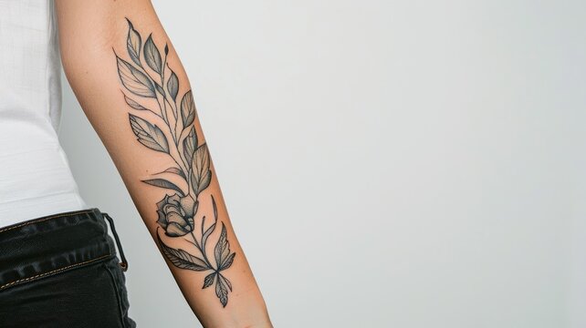 Minimalist Floral Arm Tattoo on Light Brown Skin with Beige Background Detailed Fine Line Design