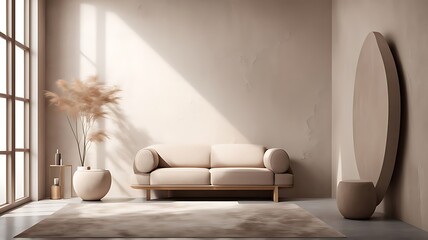 Light beige living room - modern interior hall and furniture design. Mockup for art - ivory taupe empty texture plaster microcement wall. Luxury premium nude accent lounge reception. 3d render