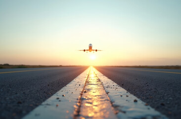 Front view of a modern passenger airplane taxiing on the runway at sunset. The aircraft is predominantly white with visible engines and landing gear. : Generative AI