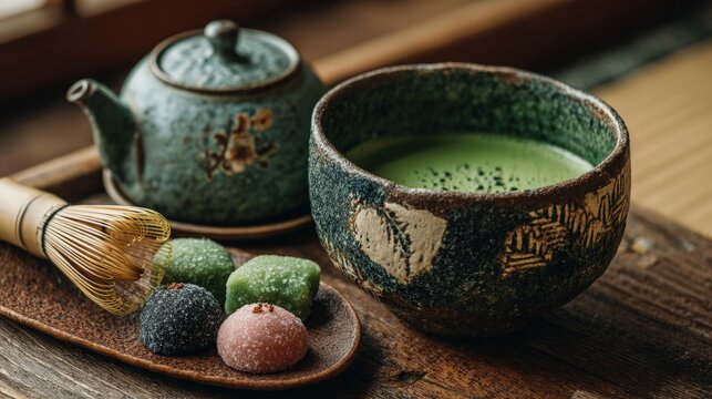 Traditional japanese anime tea set in tranquil tea room