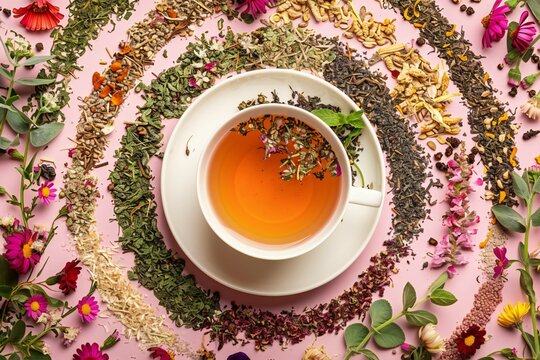 Top view of Soothing hot Tea in white cup surround with various pile of dry tea and herbal flowers on  pink   background , created by ai