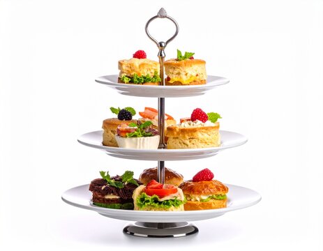 An elegant three-tiered stand showcasing an assortment of delectable miniature sandwiches and sweet pastries, beautifully garnished and presented for a sophisticated afternoon tea.