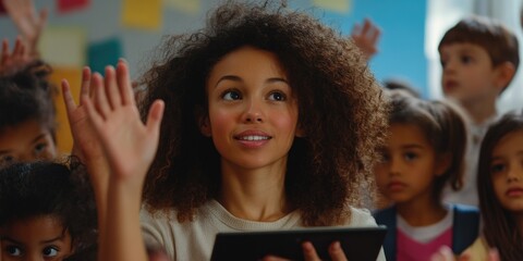 Diverse classroom with children using computers. Teacher assists students. Kids learning with technology. Engaged children in a modern educational setting. International students working on computers.